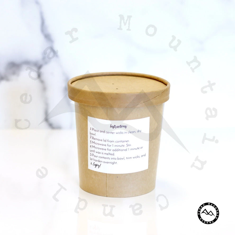 Each kit comes with a microwavable compostable container filled with scented soy wax, wicks, wick stickers, and instruction label.Â