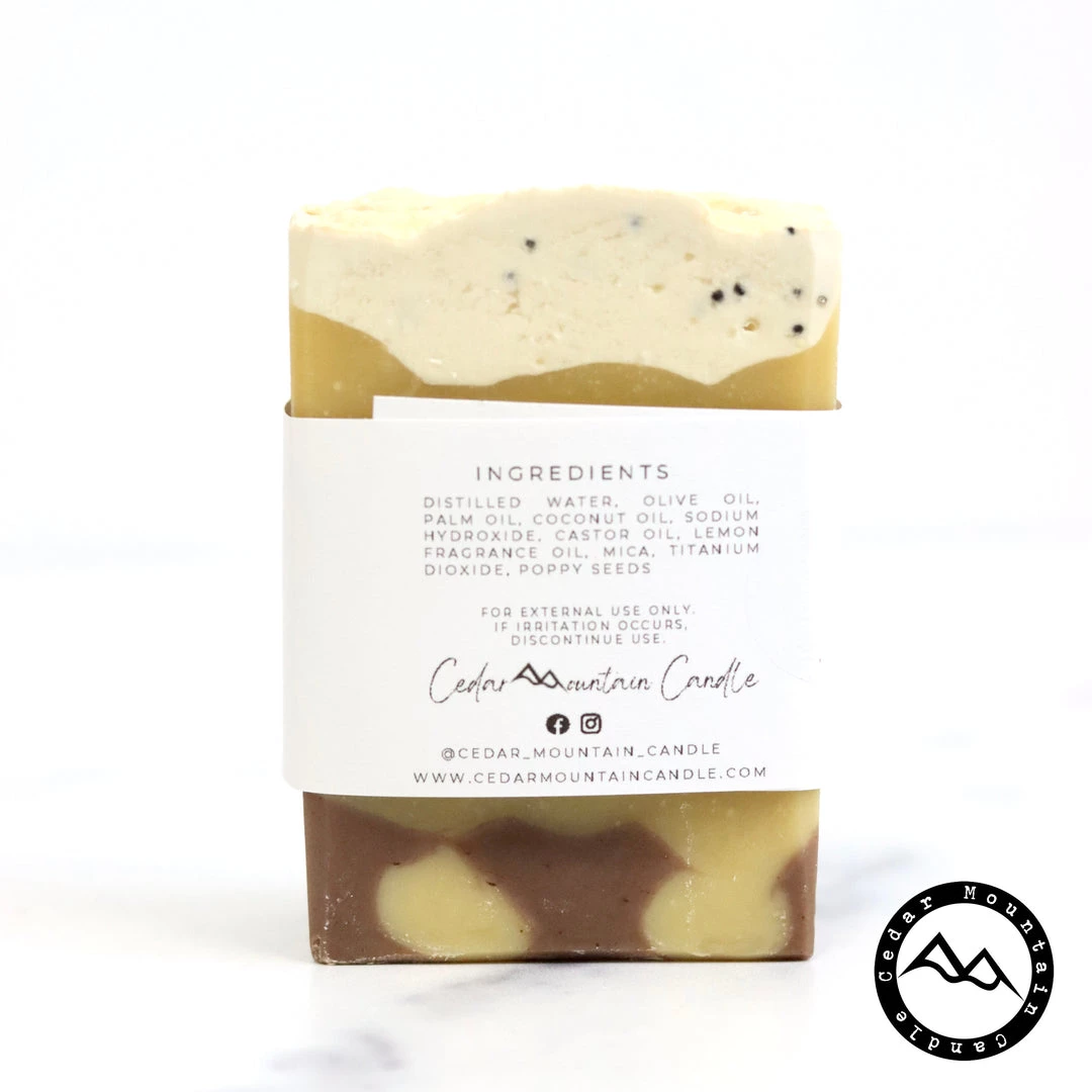 Ingredients: water, olive oil, palm oil, coconut oil, sodium hydroxide, castor oil, lemon pound cake fragrance oil, mica, titanium dioxide, poppy seeds