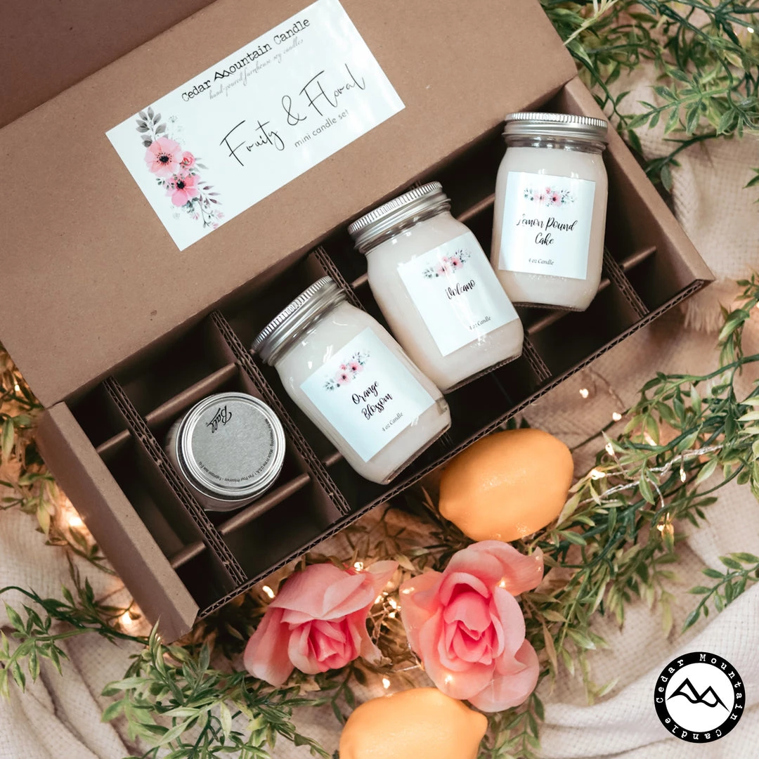 This is the Fruity and Floral Collection Mini Mason Jar Candle Set in a set of 4 mini candles. Scents: Mango & Coconut Milk, Volcano, Orange Blossom, Lemon Pound Cake