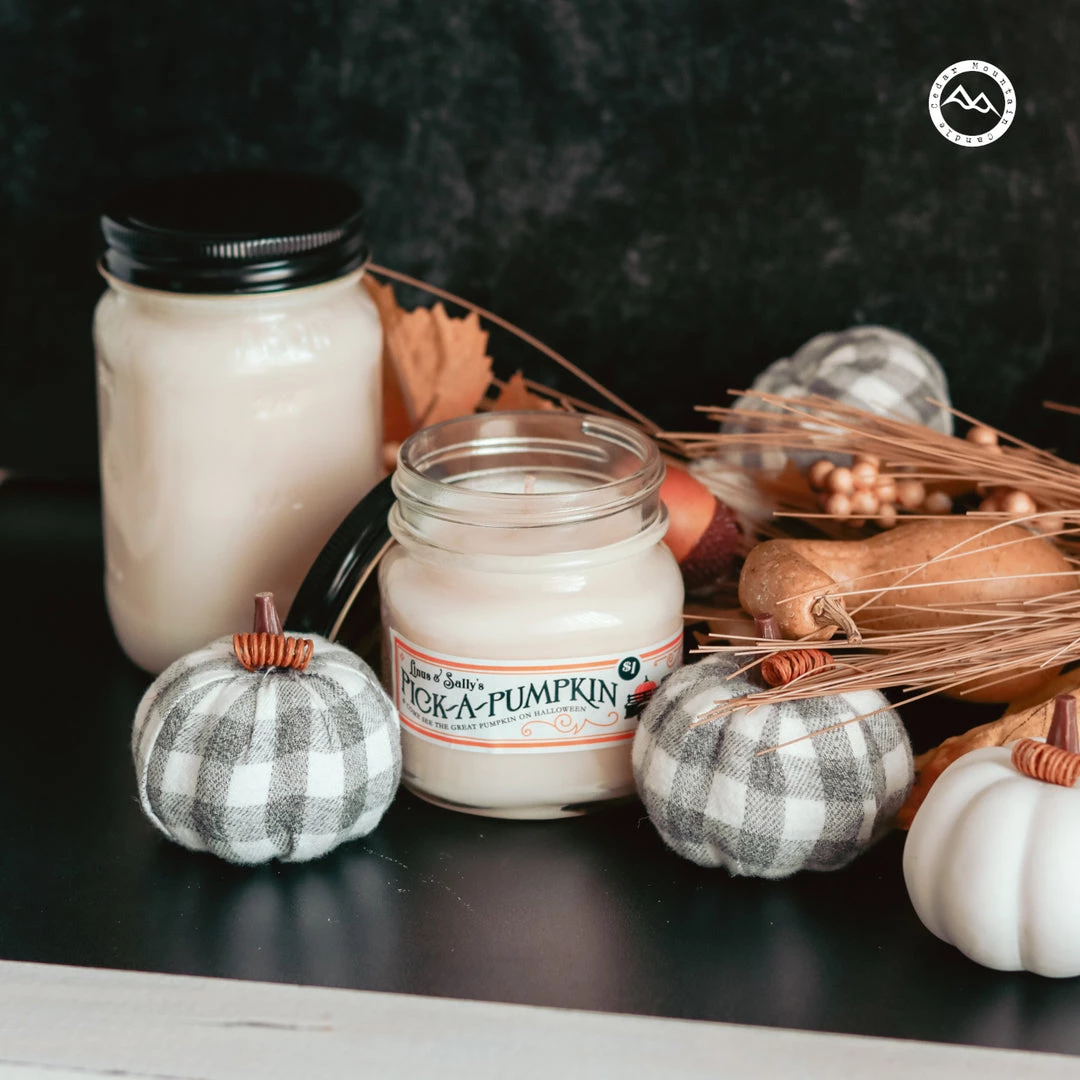 Linus & Sally’s Pick a Pumpkin fall label comes in two scents: Blueberry Pumpkin & Pumpkin Souffle in our 6.5 oz and 13 oz mason jars.