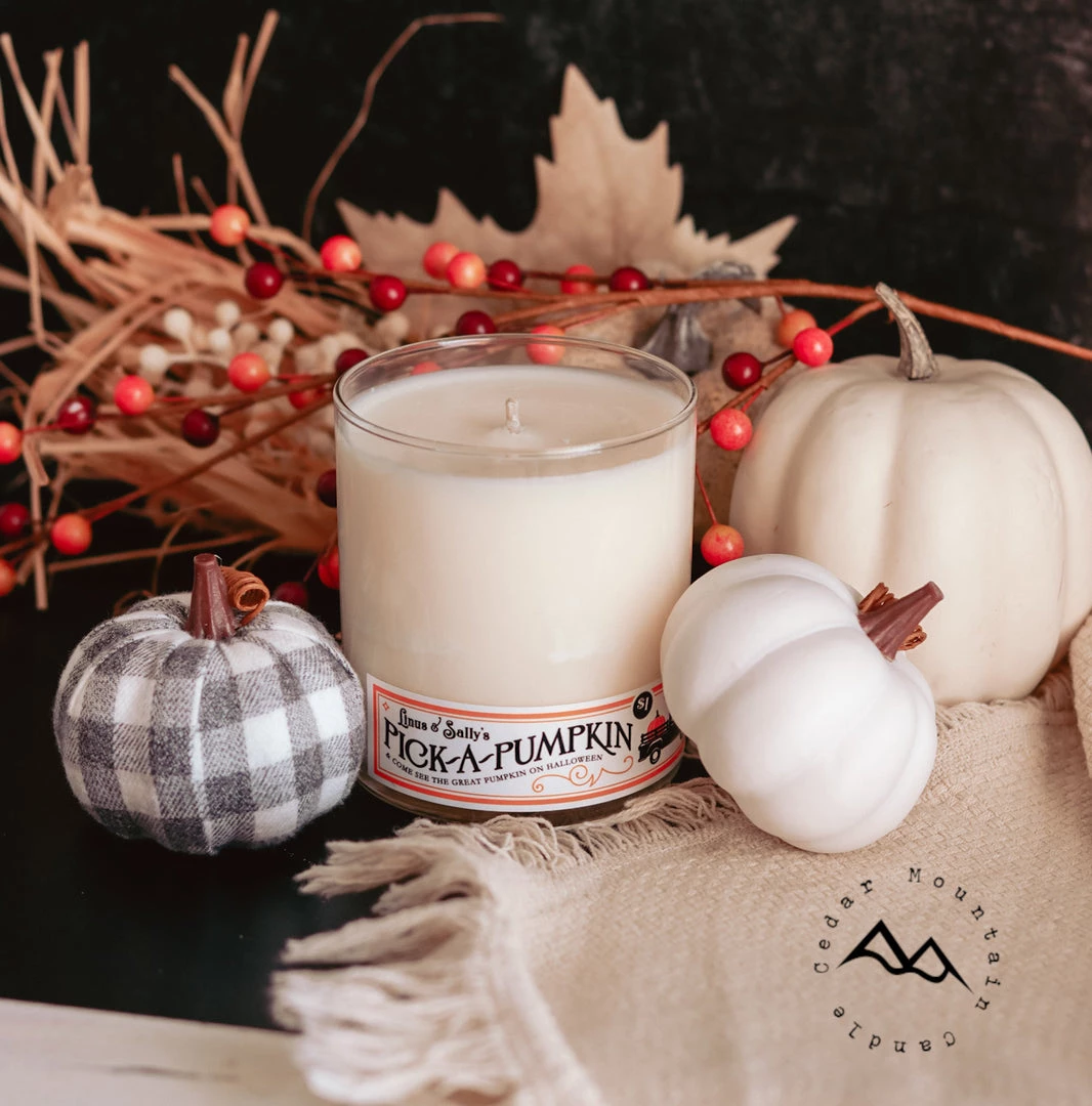 Linus & Sally’s Pick a Pumpkin fall label comes in two scents: Blueberry Pumpkin & Pumpkin Souffle in our rose gold lid whiskey jars.