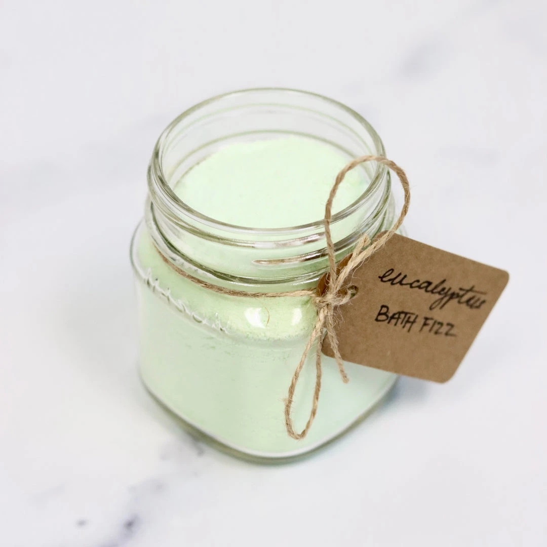 Our eucalyptus bath fizz is all natural infused with essential oils and colored with natural mineral mica powder. Eucalyptus is soothing and relaxing. Simply pour bath fizz in a hot bath and soak. Helps with relaxation and reduces stress.Â