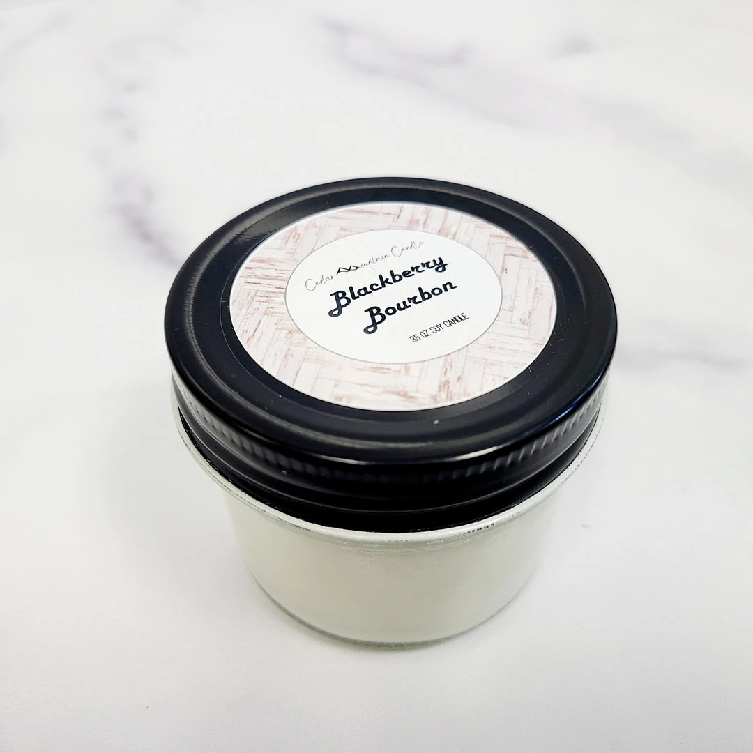 Cedar Mountain Candles are 100% soy wax infused with essential oils. This rustic farmhouse style travel tin jar is in the scent Blackberry Bourbon.Â