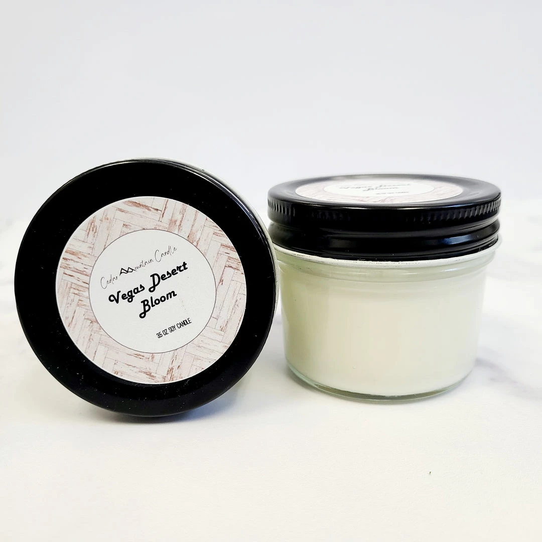 Cedar Mountain Candles are 100% soy wax infused with essential oils. This rustic farmhouse style travel tin jar is in the scent Vegas Desert Bloom.Â