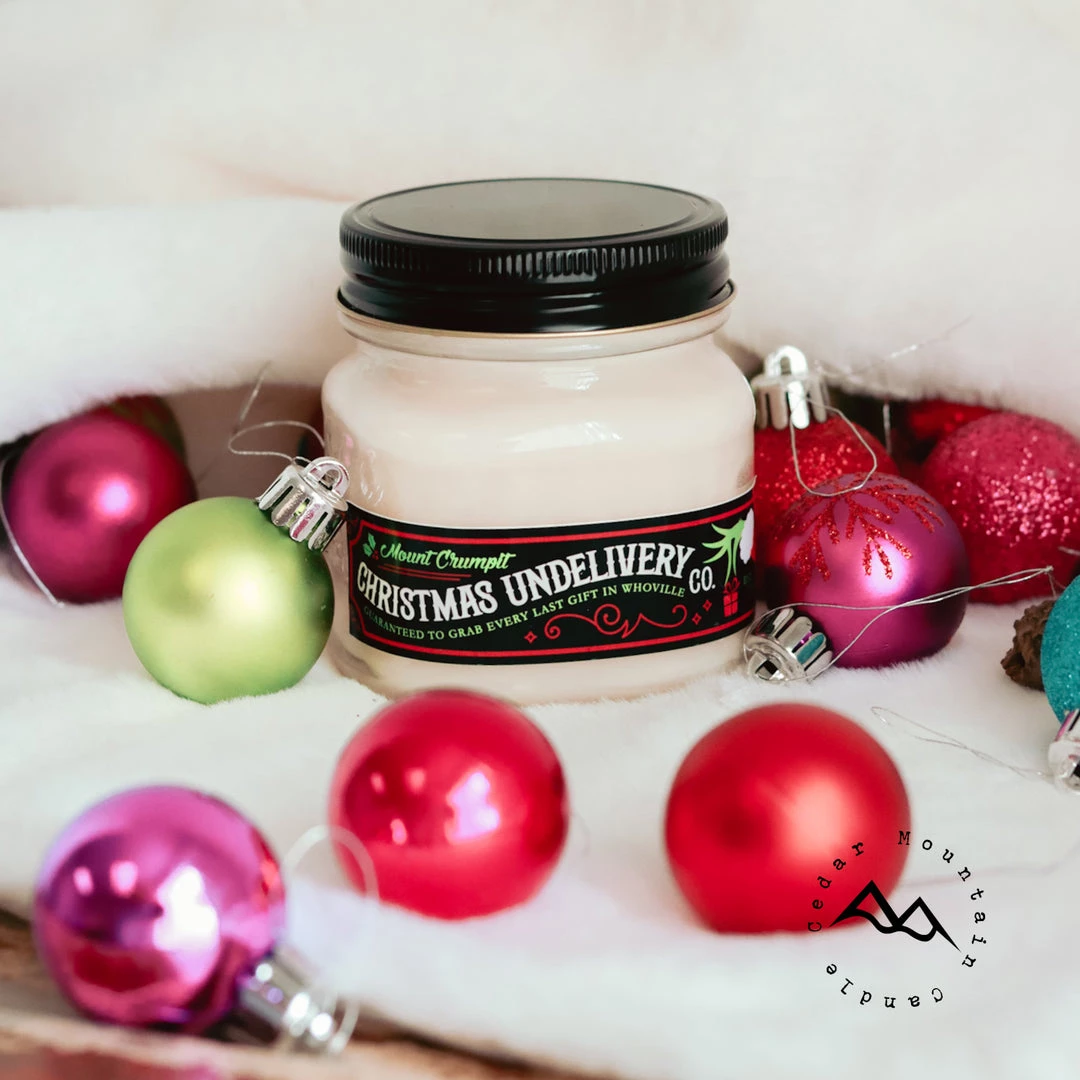 Grinch Christmas Undelivery is part of our new Christmas labels and it’s available in a special selection of winter scents in both 6.5 oz and 13 oz mason jar soy candles.